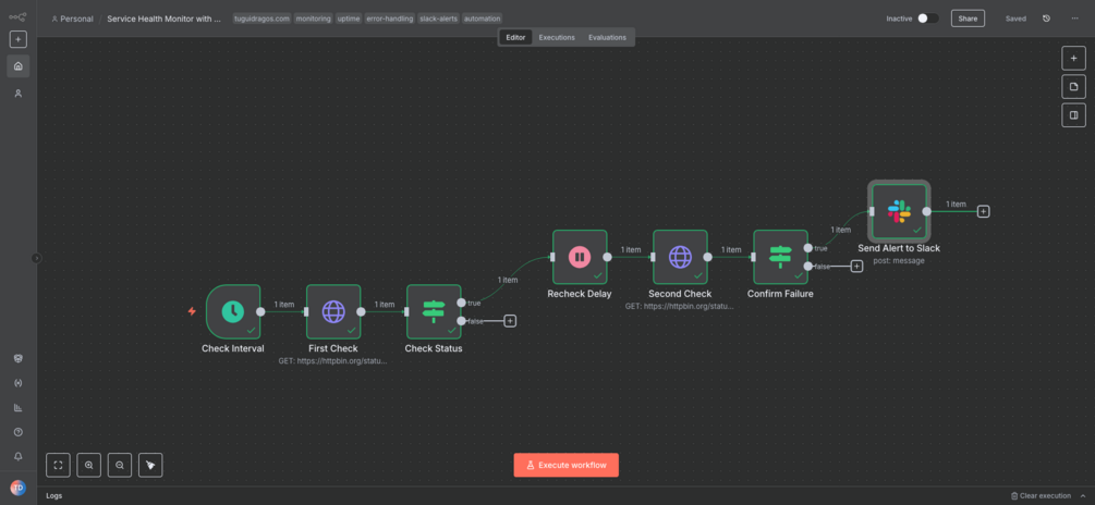 Monitor your web services and APIs with n8n. This workflow performs scheduled HTTP checks, retries failed requests to avoid false alerts, and sends real-time Slack notifications only when a service is truly down.
